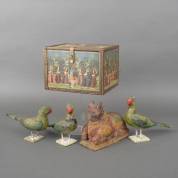 Divers kleingoed: drie beschilderde houten parkieten, polychroom beschilderd houten beeld van Nandi de stier, India, en een beschilderd houten klepkistje met zes laatjes achter de klep, India -beeldjes met defecten-, afmetingen kistje 19 × 27,5 × 20 cm