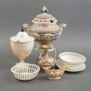 Divers aardewerk, waaronder: soepterrine in renaissancestijl, urnvormige terrine, Zsolnay kruikje en mandje -defecten-