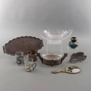 Divers kleingoed, art nouveau en art deco, waaronder: handspiegel, verzilverde tafeljardinière met geslepen glazen binnenbak -chipje-, en Val St. Lambert persglazen kom
