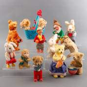 Elf dieren, een kabouter en een clown met opwindmechaniek, jaren '40-'50 -bespeeld, mandje met gebroken hengsel-, kaboiuter 22 cm