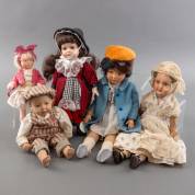 Vijf poppen, waaronder uitvoering Götz, Heidi Ott, en Leonardo, 20e eeuw -klederdrachtpop is sleets, kleine defecten-, grootste 48 cm
