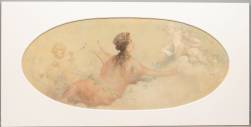 Plafond/muurschildering: muze met lier, omringd door drie putti, olieverf op doek, niet gesigneerd, 20e eeuw -gedoubleerd-, 82 × 183 cm