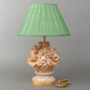 Tafellamp met groene kap en gesneden houten voet: fruitmand -druppel kaarsvet op kap, krimpscheur in hout-, 60 × Ø 40 cm
