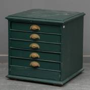 Groengeschilderd fourniturenkastje, circa 1900 -scheur in bovenblad-, 40 × 39 × 36 cm