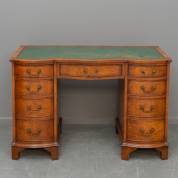 Wortelnotengefineerd bureautje, het gecontourneerde blad bekleed met groen leder, tweede helft 20e eeuw -lichte gebruikssporen-, 75 × 115 × 53 cm
