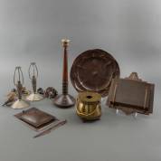 Gedreven en gehamerd koperen wandbord met geometrisch lijnendecor, Amsterdamse School, jaren '20/'30, messing theelichthouder met geometrisch decor, gehamerde koperen brievenhouder met briefopener, koperen lectuur- of correspondentiehouder, houten tafellamp, en paar metalen tafellampjes met bajonetfitting, Frankrijk, alle art deco, circa 1920 -minieme defecten-, bord Ø 30 cm