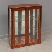 Mahonie vitrinekast, de twee deurtjes en zijwanden met roedeverdeling, twee glazen plankjes, achter de witte achterwand bevindt zich een spiegel -minieme krasjes-, 74 = 58 × 22,5 cm