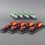 Twee series van vier speelgoedvrachtwagens, inclusief doosjes
