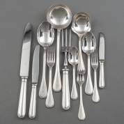Achtpersoons verzilverd bestekgedeelte met filetrand, uitvoering Christofle, bestaande uit: acht dinervorken, zeven dinerlepels, acht dinermessen, acht dessertcouverts met acht messen, acht taartvorken, en zesdelig diengerei -één dinerlepel ontbreekt-