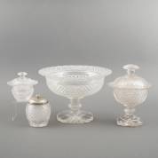 Divers kristal met ruitslijpsel, bestaande uit: grote coupe, gembercoupe met deksel, theebus met 2e gehalte zilveren deksel en dekselpotje, 19e eeuw -kleine chipjes/randschilfers-, grote coupe 20 × Ø 30 cm