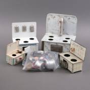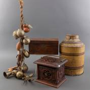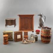 Divers kleingoed, waaronder: miniatuurmeubelen, tinnen kan, gekuipt tonnetje en blik in de vorm van een commode