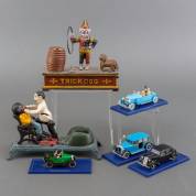 Twee gietijzeren spaarpotten: 'Trick dog' en tandartsbezoek, daarbij: vier modelauto's uit Kuifje, uitvoering Moulinsart, afmetingen 'Trick dog' 18 × 20 × 10 cm