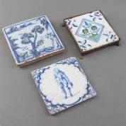 Drie aardewerk tegels: één dikke met blauw-wit landschapsdecor in Chinese stijl, één met blauw-witte staande man, en één kwadraattegel met polychroom bloemdecor