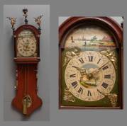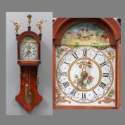 Fries kantoortje met wekker in eiken kast bekroond door engelen en atlas, op de polychroom beschilderde wijzerplaat een dorpsgezicht met molen, 19e eeuw -gewichten en slinger aanwezig-, 110 × 28 × 19 cm