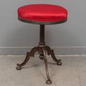 Gietijzeren pianokruk met rode stoffering en driepoot, in hoogte verstelbaar, circa 46-61 × Ø 35 cm