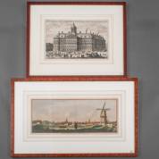Twee kopergravures: 'De Stad Utrecht van het Paarden Veld te zien', handingekleurd, Jan Caspar Philips naar Jan de Beyer, 1756, 17,5 × 41 cm, en Paleis op de Dam, 'Le Frontispice de la Maison de Ville. 't Stadt Huys van vooren aen te sien', uit de Franse editie van 'Historische Beschryving der Stadt Amsterdam' van Olfert Dapper, eind 17e eeuw, 21 × 31 cm