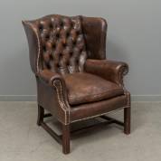 Donkerbruine lederen oorfauteuil op mahonie onderstel -beetje wankel-