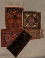 Vijf kleine Perzische tapijtjes, voornamelijk Belouche, grootste 68 × 55 cm