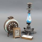 Divers kleingoed: kandelaar met porselein in de stam, twee klokjes, en geëmailleerd doosje