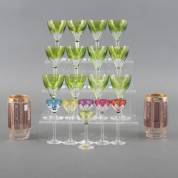 Twaalf kristallen wijnglazen met groene kelken, 13,5 cm hoog, zes likeurglaasjes met gekleurde kelken en twee kristallen glazen met paars en goud decor -enkele lichte gebruikssporen-
