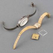 Twee polshorloges, waarvan één verguld Baume & Mercier aan crème lederen bandje met gespsluiting, de ander zilver met geïntegreerde band, daarbij: los Eterna-Matic uurwerk