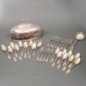 Ovale verzilverde cloche met parelrand, en verzilverd bestekgedeelte spatelfilet, WMF 90, gemonogrammeerd V, bestaande uit: negen grote lepels, acht kleine lepels, zeven grote vorken, vier kleine vorken, soepdienlepel en groentelepel -cloche met deukje-, cloche inclusief handvat 38 × 24,5 × 21 cm