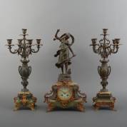 Driedelig messing pendulestel, bestaand uit pendule en twee vijflichts kandelaars op groen natuurstenen basement, 19e/20e eeuw -gebruikssporen, glas klokje met barst en ornament kandelaar ontbreekt-, 57 × Ø 26 cm