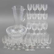 Divers glaswerk, 19e eeuw: glazen karaf met gegraveerd korenaardecor, elf sherryglaasjes en elf likeurglaasjes met gegraveerde bloemslingers, zes kristallen wijnglaasjes en vijf sherryglaasjes met guilloche-decor -één met miniem chipje-, en spoelbak met geslepen druivendcor, hoogte karaf 24 cm