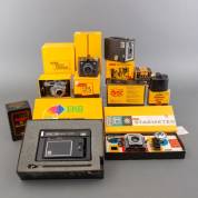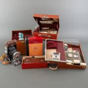 Verzameling diverse Kodak camera's en toebehoren in doos: Baby Brownie's, Flash Six 20, EK8 instant camera, etc.