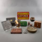 Divers kleingoed, waaronder: blikken, zwartgelakt correspondentiekistje, palissandergefineerd kistje met parelmoer inlegwerk, gietijzeren plaquette 'Vivat Nassau Oranian Diez' en verzilverde kinderbekers