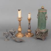 Diverse gegraveerde messing altaarkandelaars -enkele gebogen randdecoraties-, daarbij: een bronzen grand tour olielamp -één los pootje, deksel ontbreekt-, 19e eeuw, hoogste circa 49 cm