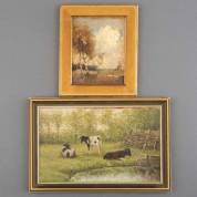 Hollandse School, twee werken: koeien bij een plas, olieverf op board, niet gesigneerd, 17,5 × 28, en berken op de heide, marouflé, l.o. onduidelijk gesigneerd, 15,8 × 12,2 cm