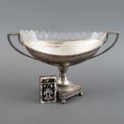 Ovale verzilverde schaal op voet met kristallen inzetbak, daarbij: parelmoer- en schildpadbelijmd visitekaarthouder, schaal 23,5 × 36 cm
