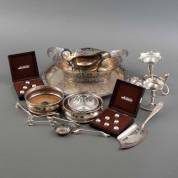 Diverse verzilverde voorwerpen, waaronder: bloemenvaas, broodmand, paar flessenbakken, etc.