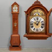 Klein wortelgefineerd staand horloge op basement, met maanstand en datumaanduiding, inclusief slinger en gewichten, adres: Warmink, 20e eeuw -lichte gebruikssporen-, 183 × 40 × 24 cm