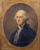 Schilderij: portret van George Washington, kopie naar origineel van Gilbert Stuart (1755-1828), olieverf op doek, onderin gesigneerd R. Kinson en gedateerd 1898 -gerepareerde scheur en gaatje in doek-, 92 × 74 cm