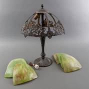 Bureaulamp met zes groene glazen panelen, zogenaamd 'slag glass', circa 1900 -defecten, glas heel maar niet gemonteerd in kap, bedrading dient vervangen te worden-, hoogte 57 cm