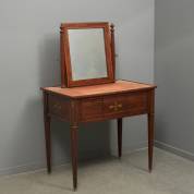 Mahonie kaptafel met kantelbare spiegel, gestoffeerd blad, messing biezen en Maltezer kruizen, en twee lades, 19e eeuw -defecten aan messing inlegwerk, gebruikssporen-, 140 × 89 × 57 cm