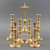 Zeven messing kandelaars, waaronder drie paar, veelal Engeland, 19e eeuw, hoogte 28,5 cm