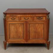 Mahonie klapbuffet met overhoeks geplaatste kariatiden en ingelegde messing biezen, in het blad een tinnen spoelbak, circa 1800 -enkele kleine fineerschades, en loszittende of ontbrekende messing biezen-, 90 × 110 × 54 cm