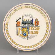 Aardewerk memoriebord: 100 jaar spoorwegen NS 1839-1939, uitvoering Goedewaagen, Gouda -glazuurcraquelé-, Ø 24,5 cm