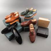 Vier paar herenschoenen: paar groen lederen brogues, uitvoering Church's, twee paar bruin lederen dover schoenen, uitvoering Edward Green en een paar fluwelen loafers, ook uitvoering Edward Green, alle maat 9½, daarbij: John Lobb schoenenpoetsset in zwart lederen foedraal