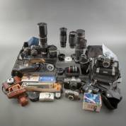 Diverse camera's, waaronder: Asahi Pentax ME met motordrive, Practica Super TL 3, Canon T50, Olympus zoom 140 AZ-300 superzoom en Pen, objectieven: Soligor tele-auto Ø 72, A-Danubia Ø 52, Canon C8 wide attachment 43, diverse filters, belichtingsmeters, etc. -gebruikssporen-, diverse afmetingen