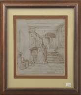 Johannes Anthonie Balthazar Stroebel (1821-1905), doorkijkje met dame en hond in hal, inkttekening op papier, r.o. gesigneerd en gedateerd '51, 21 × 18,5 cm