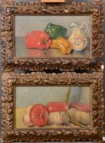 Paar stillevens: sierpompoenen bij spiegel, en paprika's met oorkan, olieverf op board, niet gesigneerd, 21 × 40 cm