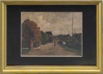 Hollandse School: vrouw met kind in dorp met trekvaart, olieverf op drager, niet gesigneerd, begin 20e eeuw -kras r.b.-, 14 × 19,4 cm