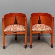 Twee gebogen houten kuipstoelen met gestoffeerde kussens, art deco-stijl, eind 20e eeuw