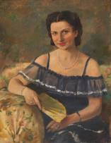 Hollandse School: portret van vrouw met waaier, olieverf op board, l.o. onduidelijk gesigneerd en gedateerd 1947, 88,5 × 68,5 cm