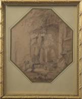 Kate Bisschop-Swift (1834-1928), paar met kind in de deuropening, aquarel en potlood op papier, r.m. gesigneerd, 24 × 20 cm