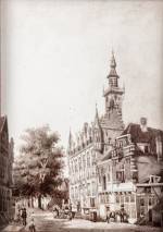 Porseleinen plaquette met sepiakleurig decor naar Cornelis Springer: Stadhuis van Veere, uitvoering Haagsche Plateelbakkerij Rozenburg, Den Haag, 1896, 29 × 20,5 cm